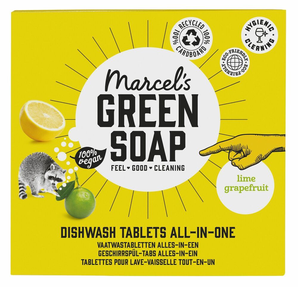 Marcel's Green Soap Vaatwastabletten Limoen & Grapefruit zitten vol met natuurlijke ingrediënten en zijn voor maar liefst 97% biologisch afbreekbaar. De tabletten zijn ontwikkeld zonder kleurstoffen, parabenen, fosfaten, chloor en ammonia en geven een heerlijke geur af.